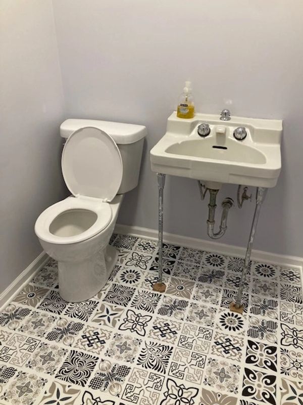 New fixtures in the expanded bathroom. Carpet replaced with tile. New lighting and fan.